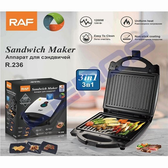 ساندویچ ساز راف مدل R-236 از ظاهر شکیلی برخوردار است و در رنگ مشکی موجود است، و در کنار این زیبایی ویژگی های بسیار دارد. 3 صفحه جدا شونده و قابل شستشو دارد. صفحه اسنک زن که با آن می توانید اسنک های خوشمزه با طعم مورد دلخواه خود و افراد خانواده در یک عصر دلنشین تهیه کنید. با صفحه ی وافل ساز یک وافل خوشمزه برای صبحانه آماده کنید. و صفحه ی گریل که گوشت را در آن برای یک وعده ی کامل می توانید گریل کنید و میل کنید.